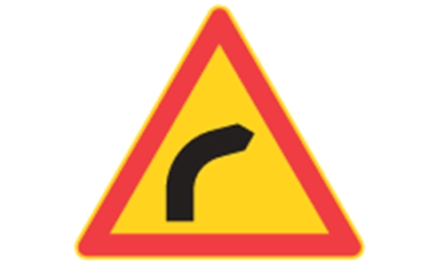 In Finland, a triangular warning sign with a red border and a black curved arrow pointing left warns drivers of a left-hand bend ahead.